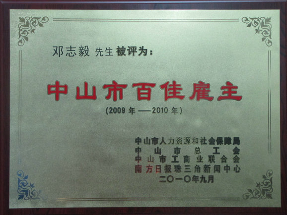 2010年9月13日下午2:00,中山市2010年度百佳雇主頒獎典禮暨“同是中山建設(shè)者”百佳流動務(wù)工人員評選活動啟動儀式在市文化藝術(shù)中心大劇場舉行。伴隨著現(xiàn)場近千名觀眾的熱烈掌聲,由中山市人力資源和社會保障局、中山市總工會、中山市工商聯(lián)以及南方日報珠三角新聞中心共同舉辦的“中山市首屆百佳雇主”評選結(jié)果正式揭曉,我司在眾多申報企業(yè)中脫穎而出,獲“中山市首屆百佳雇主”殊榮。