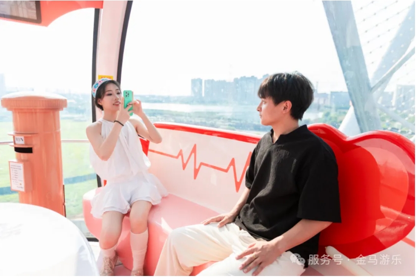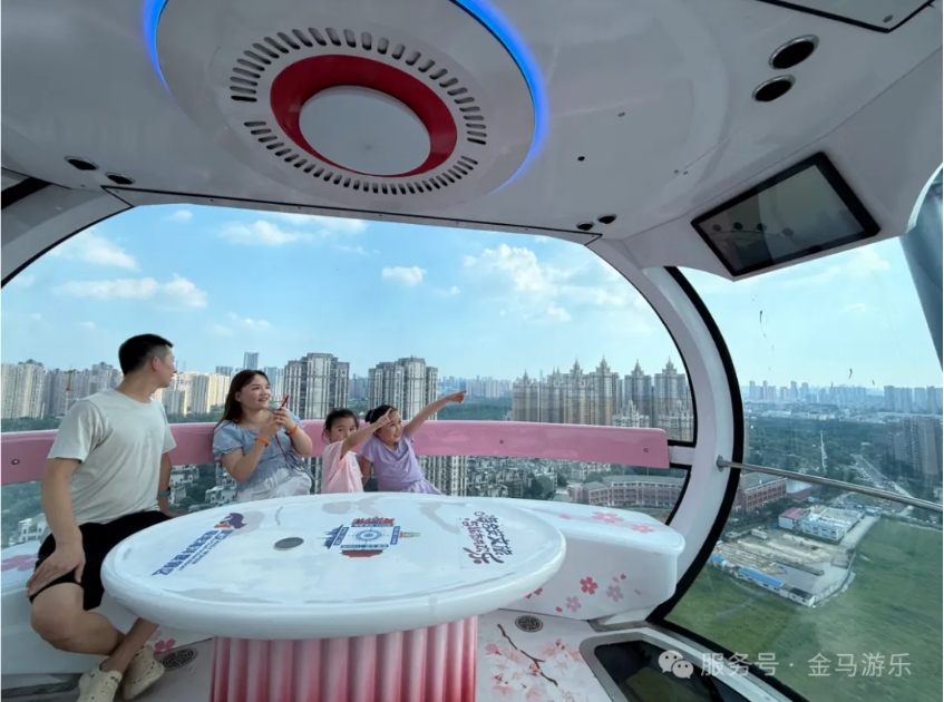 轉(zhuǎn)輪配備36個面積國內(nèi)領(lǐng)先的的橢圓形全景“太空艙”轎廂,單艙面積約6平方米,可容納8-10人,滿載可乘坐352人。艙內(nèi)設(shè)有環(huán)形座椅及中央活動區(qū),滿足全家同乘的寬敞舒適需求。獨(dú)特的吊掛式橢圓轎廂搭配360°全透明玻璃幕墻,營造無死角全景視野,游客可盡覽景區(qū)及壯闊長江風(fēng)光,仿佛置身云端,感受城市脈動。艙內(nèi)更融合技術(shù)創(chuàng)新與美學(xué)設(shè)計(jì),打造了涵蓋極地、愛情、童趣等多種風(fēng)格的主題艙,以及驚險刺激的底部透明艙,支持婚禮、慶生、商務(wù)派對等主題定制活動。此外,艙內(nèi)還配備電子屏實(shí)時拍照、燈光氛圍調(diào)節(jié)等功能,滿足多元化場景需求。通過以上創(chuàng)新設(shè)計(jì),成功將“楚天之眼”從傳統(tǒng)的觀景設(shè)施升級為多功能社交空間,塑造了武漢文旅新地標(biāo)。